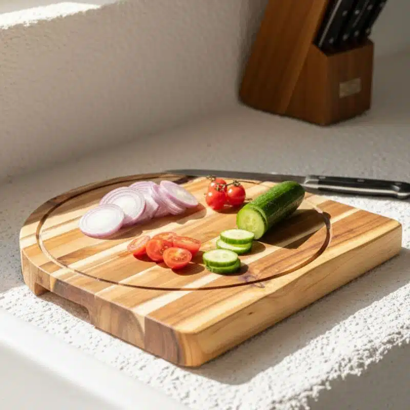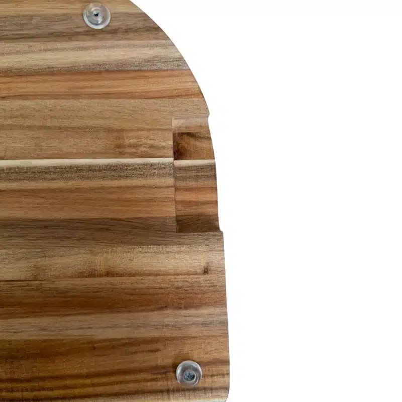 Deze ronde snijplank is vervaardigd uit hoogwaardig acaciahout, bekend om zijn warme kleur, prachtige nerf en duurzame eigenschappen. Met een royale diameter van 32 cm en een stevige dikte van 3 cm biedt deze plank volop ruimte om comfortabel te snijden, hakken en serveren.