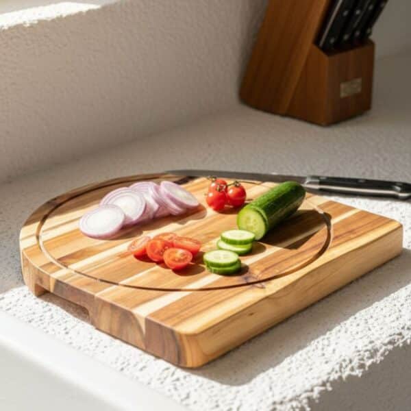 Dankzij het robuuste ontwerp blijft de snijplank stabiel op het aanrecht, terwijl het natuurlijke hout zacht is voor je messen. Ideaal voor dagelijks gebruik in de keuken, maar ook perfect om hapjes, kazen of brood stijlvol te presenteren tijdens een borrel of diner.