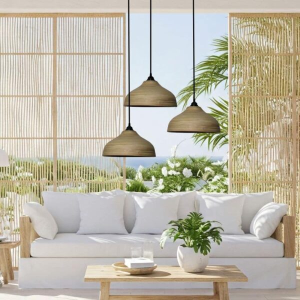 De hanglamp is gemaakt van Bamboe. De lampenkappen zijn behandeld tegen schimmel, dus verder onderhoud is niet nodig. wil je de lampenkappen toch schoon maken? Gebruik dan een vochtig doekje.