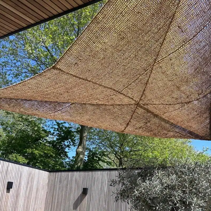 Materiaal: Het schaduwdoek is gemaakt van 100% kokosvezels, een stevig en ademend materiaal. Het geeft een mooie, rustieke look aan je tuin. De hoeken zijn extra verstevigd en voorzien van metalen ringen, zodat je het doek makkelijk kunt ophangen aan palen, muren of bomen.