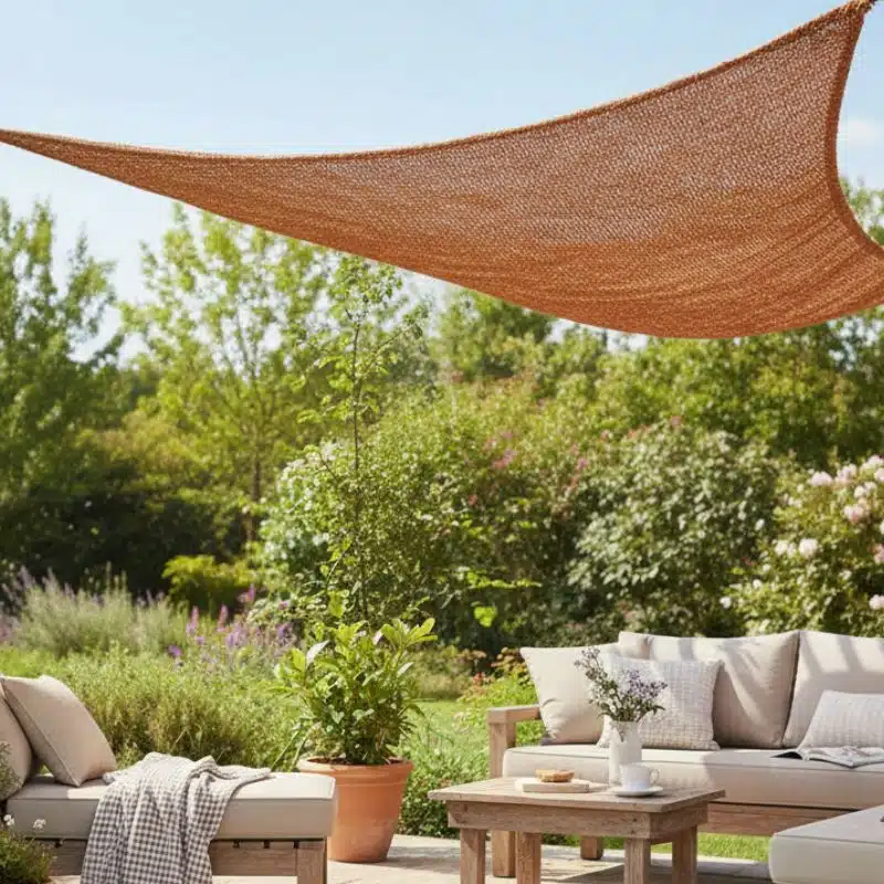 Materiaal: Het schaduwdoek is gemaakt van 100% kokosvezels, een stevig en ademend materiaal. Het geeft een mooie, rustieke look aan je tuin. De hoeken zijn extra verstevigd en voorzien van metalen ringen, zodat je het doek makkelijk kunt ophangen aan palen, muren of bomen.