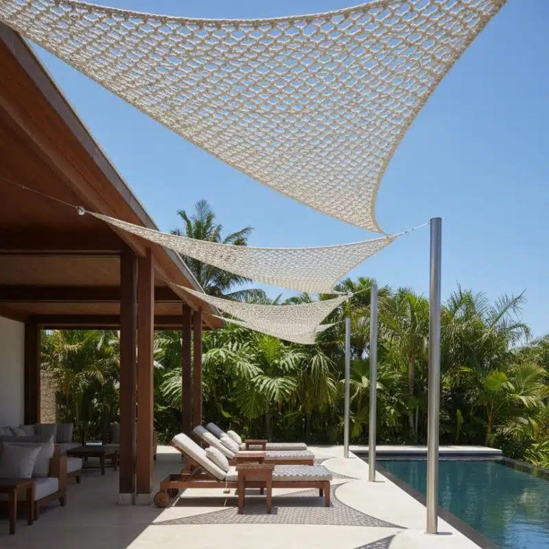 Materiaal: Het schaduwdoek is gemaakt van macramé, een stevig en ademend materiaal. Het geeft een mooie, lichte look aan je tuin. De hoeken zijn extra verstevigd en voorzien van metalen ringen, zodat je het doek makkelijk kunt ophangen aan palen, muren of bomen.