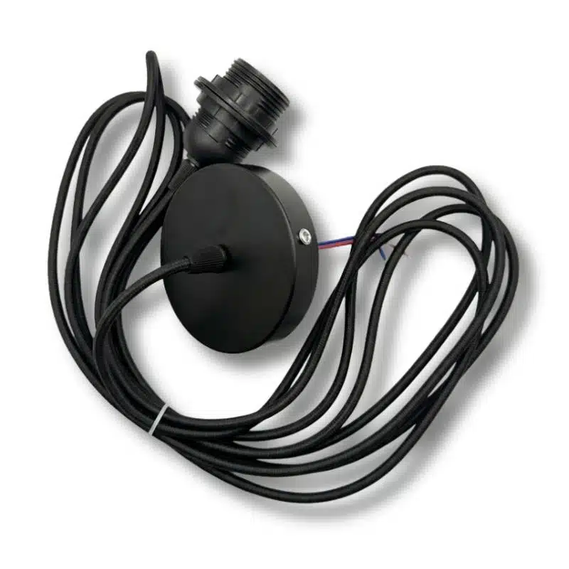 Deze fitting is 400 cm. Wil je je hanglamp aan een lang draad hebben? Dan is dit de perfecte fitting. Dit is het zwarte draad. Dit product bestaat uit een plafondkapje, draad en fitting. Het draad noem je ook wel strijkijzersnoer door het geweven materiaal.