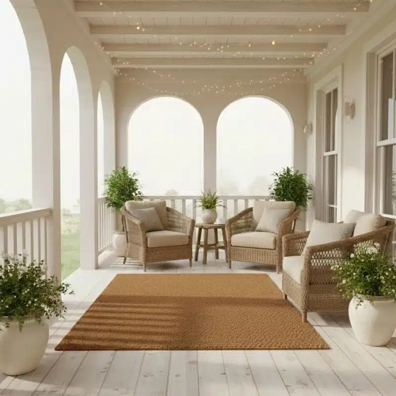 Dit is een vloerkleed dat direct sfeer en warmte creëert. Dit vloerkleed wordt minder binnen gebruikt, omdat het kokosvezel af en toe een beetje los kan laten wat voor binnen niet erg aangenaam is. Voor buiten maakt dit loslaten van een beetje kokosvezel vaak niet uit.