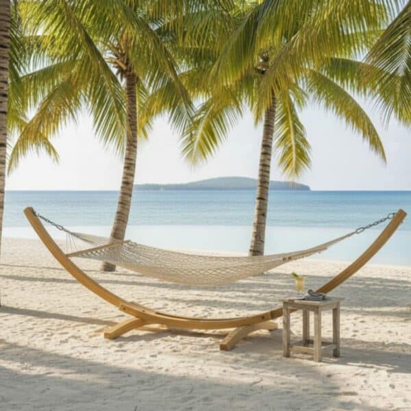 Stylingtips: Deze hangmat past goed bij een bohemian of Ibiza-stijl buitenruimte. Combineer het met houten meubels, zachte kussens en groene planten voor een gezellige sfeer. Hang er lantaarns of rieten manden bij om het helemaal af te maken. Het materiaal zorgt voor een warme en uitnodigende uitstraling.