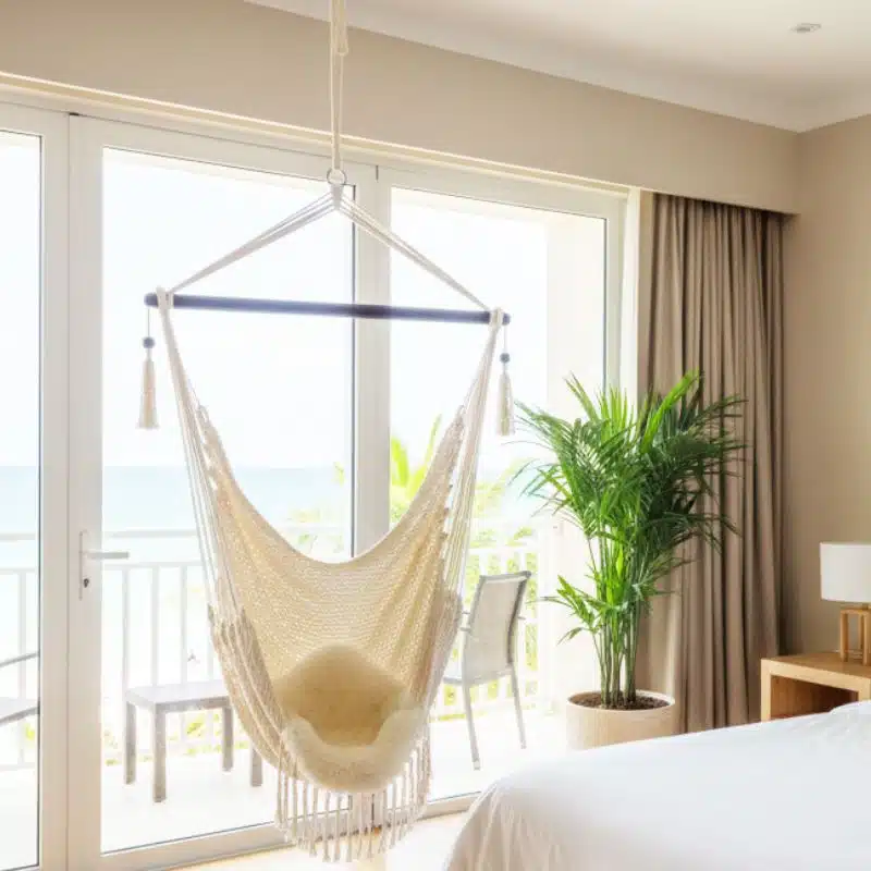 De macramé hangstoel is geen normaal meubelstuk, maar een vibe: een vleugje festival, een snufje strandhut en een flinke dosis chill. Perfect voor een boek, een dutje, of gewoon voor het stijlvol niksdoen. Eén ding is zeker: wie er eenmaal in hangt, wil er niet snel meer uit.