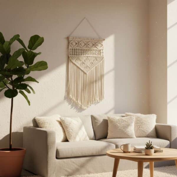 Materiaal: De muurdecoratie is gemaakt van macramé, een stevig en ademend materiaal. Het geeft een mooie, frisse look aan je huis of overkapping. Je kan deze muurdecoratie ook combineren met 1 van onze andere muurdecoraties.