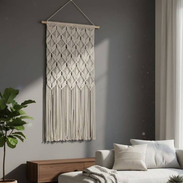 Materiaal: De muurdecoratie is gemaakt van macramé, een stevig en ademend materiaal. Het geeft een mooie, frisse look aan je huis of overkapping. Je kan deze muurdecoratie ook combineren met 1 van onze andere muurdecoraties.