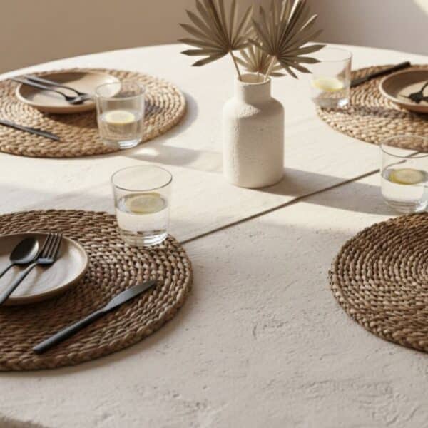 De ronde vorm van de placemat, met een diameter van 33 cm, biedt voldoende ruimte voor servies en bestek, en geeft elke tafelsetting een verzorgde uitstraling. Hij kan individueel worden gebruikt als onderlegger, maar ook gecombineerd worden met andere natuurlijke materialen, zoals servetten van linnen of houten accessoires, voor een harmonieus geheel.