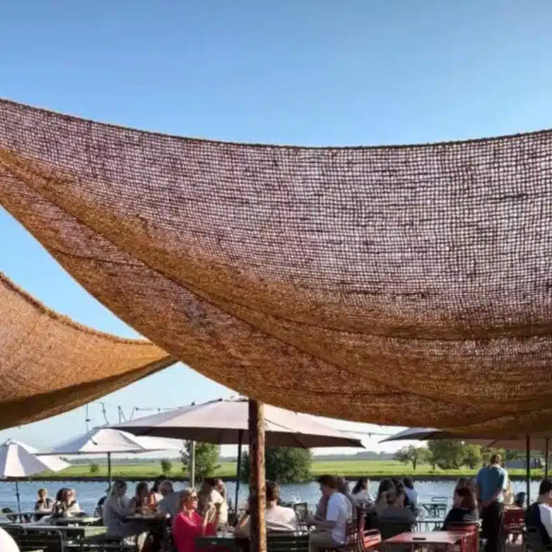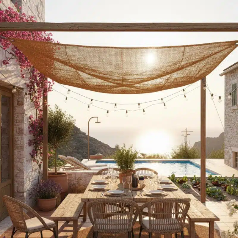 Stylingtips: Dit schaduwdoek past perfect bij een tuin in Ibiza- of boho-stijl. Combineer het met natuurlijke materialen zoals hout en rotan, leg er wat kleurrijke kussens onder, en voeg sfeerverlichting of lantaarns toe voor een gezellige avondsetting. De natuurlijke textuur van het kokosmateriaal brengt warmte en een unieke uitstraling in je buitenruimte.