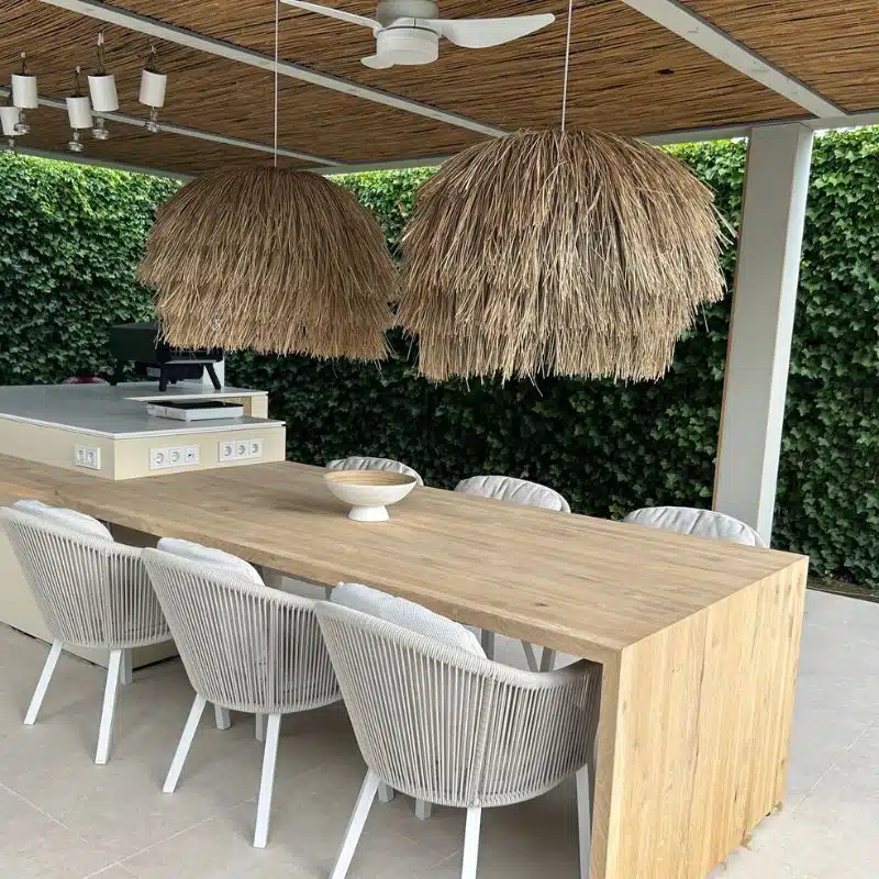 Wij raden altijd aan onze lampen overdekt te hangen. Kunnen ze nat worden door regen of iets dergelijks? Dan raden wij het niet aan om ze hier op te hangen. Kunnen de lampen droog, netjes overdekt hangen? Dan kan je de lampen gewoon onder je overkapping hangen.