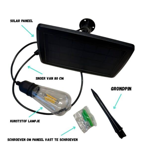Dit product bestaat uit een solar paneel, draad van 80 cm, schroeven, een grondpin & een kunststof lampje.