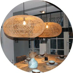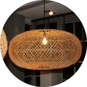 We gaan naar een compleet ander model, namelijk de hanglamp Juna. Dit is een wat plattere lamp, maar nog steeds een echte eyecatcher. De Juna komt perfect tot zijn recht boven de eettafel, in de woonkamer of zelfs in de slaapkamer. Combineer hem met andere natuurlijke materialen zoals hout, linnen, of jute voor een mooi geheel.